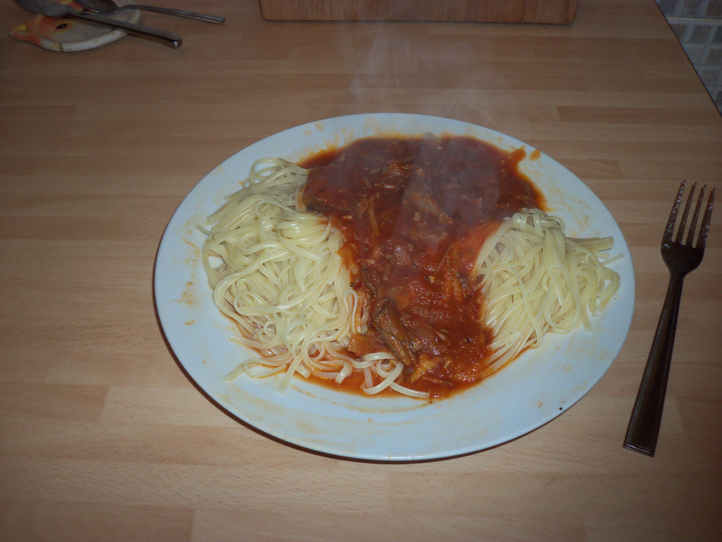 When you return, the meat should be done, either falling off the bone, or close to it. Add the tomato sauce and mix well. If the meat is falling off the bone, help it along and remove the bone, and shred the meat. If it isn't quite, don't worry about it - it will be. Give the sauce a taste and correct the seasoning; unless your broth was quite salty, it will probably need more salt. Let it cook another hour or so. Now the meat should fall off the bone. So get it off the bone, shred it fairly finely if you haven't already done so, and start your noodles.