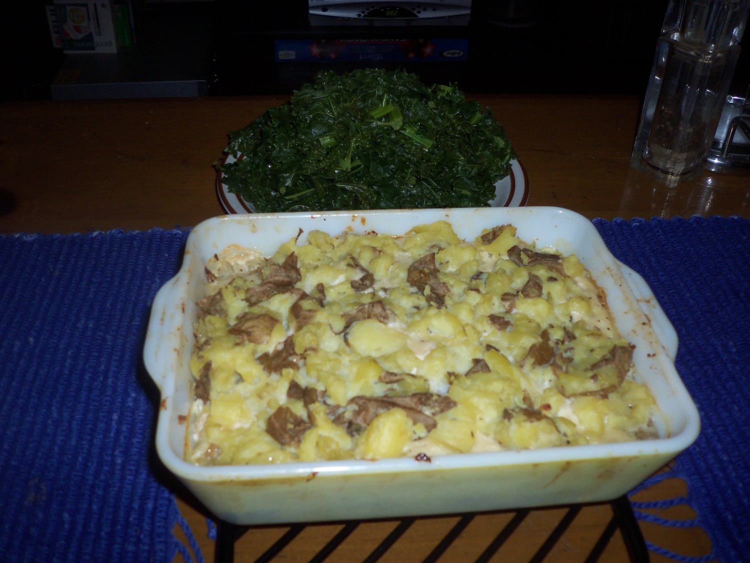Cover the top of the dish with your mashed potatoes. Put into a 350F oven for half-an-hour. Serve warm. Steamed greens make a nice side-dish.