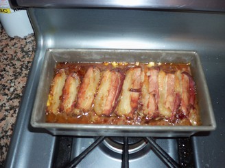 Top the terrine with bacon. Thin slices are best for this and try for pretty solid coverage. Then place it in the oven, in the water, and cook for about two hours.
