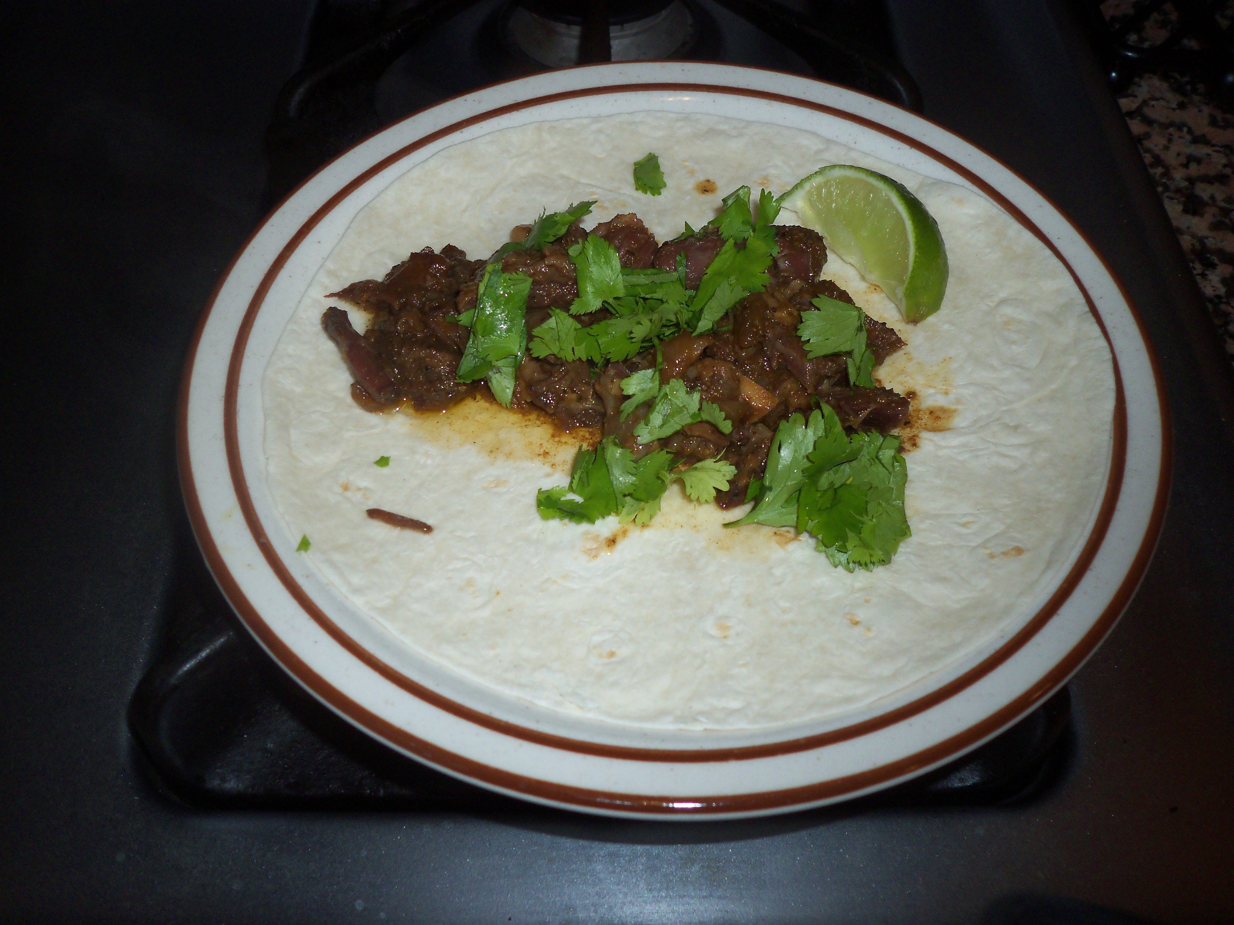 Remove the goat from the pot and let it cool a bit. Move the liquid to a small pot on the stovetop. When the goat is cool enough to handle, remove the bones. Put the meat back in the with the liquid and heat it back up to just a simmer. Simmer for a minute or two to get everything all happy together, then plate it out onto flour tortillas.