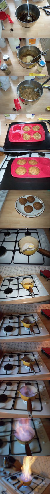 There is a Yorkshire speciality called Parkin. It's a sort of gingerbread with oatmeal, treacle, and golden syrup. Someone was handing out samples of it at our local farm shop the other day. The following recipe is not for Parkin. Rather it's for a Parkin inspired gingerbread. I decided to make it in muffin tins, or rather muffin silicones, since I had them gathering dust under the counter. I also decided to top it with whiskey sauce, since that way I can combine food, booze, and fire into one tidy little inflammable package.